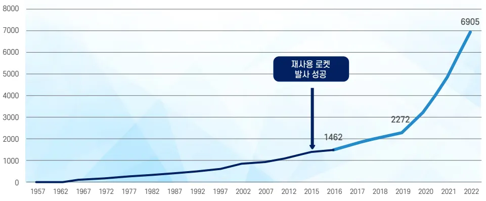 우주산업의 성장은 발사되는 위성의 수만 보더라도 알 수 있다. 2019년부터 2023년까지 위성 발사 수는 연평균 50% 이상의 성장률을 기록하고 있다. 현재 지구 궤도를 돌고 있는 위성은 2024년 5월 기준 총 9,900개로 집계되며, 이 중 무려 84%가 저궤도 위성(LEO, Low Earth Orbit)이다. 이러한 소형 저궤도 위성의 주류화는 비교적 최근의 일이다. 1990년대에는 발사된 위성 중 소형 위성은 34% 정도였으나, 2020년 들어서는 전체 발사된 위성 중 소형 위성이 94%를 차지하고 있다. 이와 함께 다양한 중소형 위성 제작업체가 생겨나며, 전통적인 EO 위성 외에도 다양한 목적의 관측 및 통신 위성들이 개발되기 시작했다. 이에 따라 지상과 우주 연결의 핵심인 위성데이터의 가격 또한 2035년까지 10% 이상 추가 하락할 것으로 기대된다.