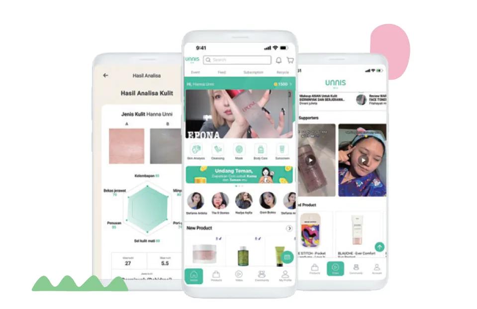 케이스타일허브는 인도네시아 시장을 대상으로 뷰티 앱 서비스를 제공하는 스타트업이에요. 주요 비즈니스 모델은 크게 두 가지인데요, 첫 번째는 K-뷰티 제품을 소비자에게 추천하고, 판매하는 뷰티 플랫폼 ‘언니스(UNNIS)’ 앱입니다. 개개인의 성향과 피부 유형에 맞는 제품을 추천하거나, 해당 제품을 구매할 수 있는 곳을 안내하는 서비스를 제공합니다. 두 번째는 K-뷰티 제품을 유통·판매하는 브랜드 ‘언니스픽(UNNIS PICK)’입니다. 언니스와 언니스픽은 모두 한국과 인도네시아에서 상표권 등록을 완료한 상태입니다.